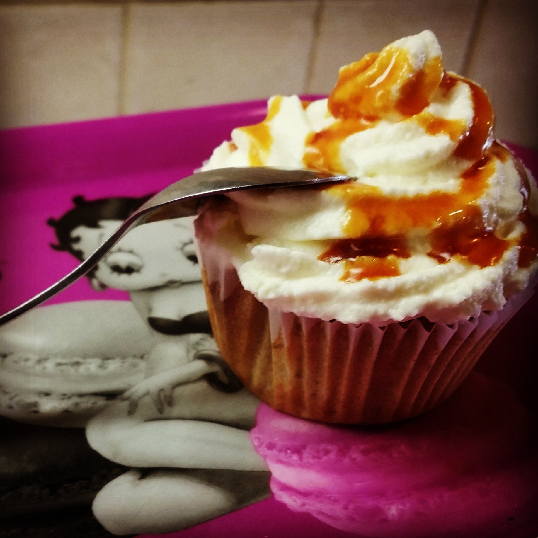 Mettre dans une poche à douille et dressez la sur les cupcakes une fois ces dernier froids. Versez sur le dessus un filet de sirop de caramel
