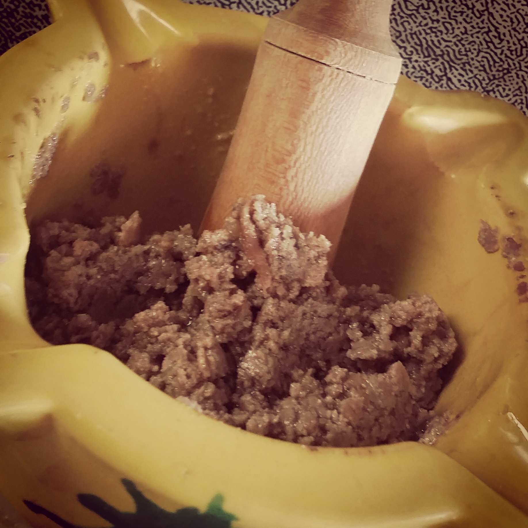 Piler au mortier les filets d’anchois avec l’ail écrasé. Ajouter l’huile d’olive goutte a goutte jusque ce que le mélange est la consistance d’une crème.