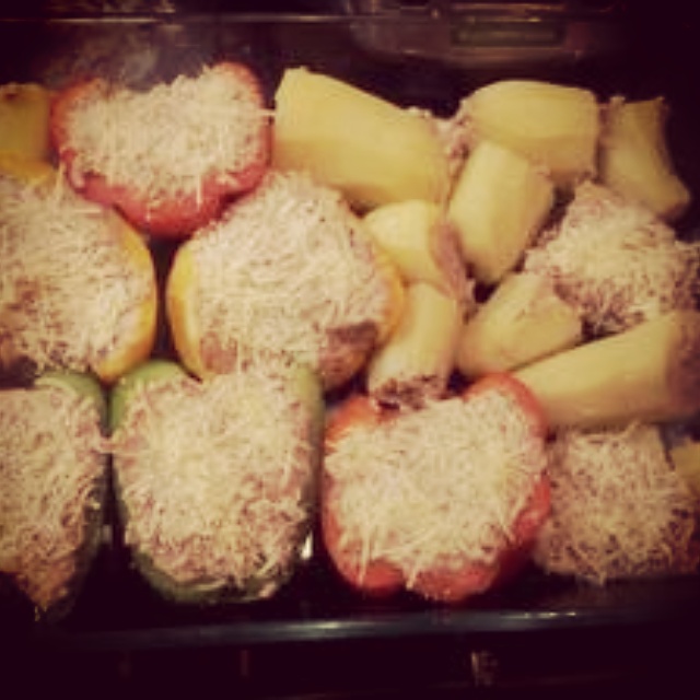 6. Videz les tomates ou autre légumes, y mettre la farce à moitié, un peu de rapé, puis de nouveau de la farce. remettre le chapeau si il y a avec un peu de margarine ou beurre dessus. ajoutez un peu d’eau au fond du plat et enfournez.