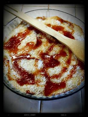 Pendant ce temps soupoudrez le plat (brioche+flan) de noix de coco râpé.