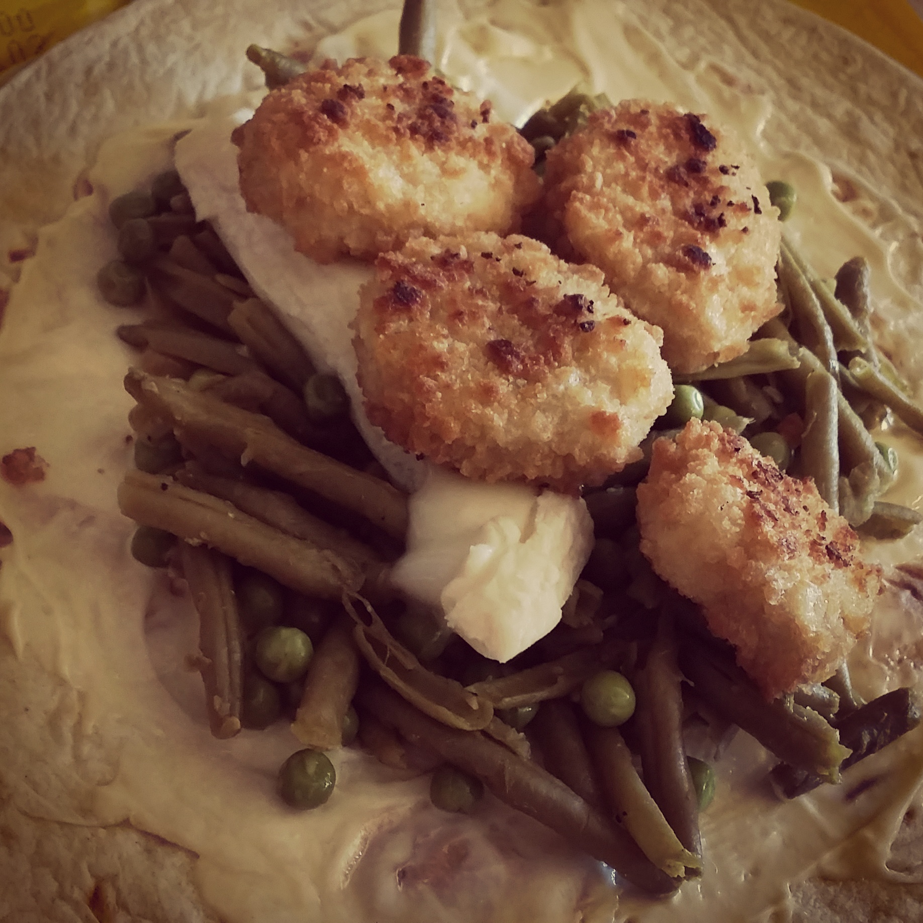Donc vous l’aurez compri on prend une galette de blé ou de maïs on met dans l’ordre une fine couche de mayonnaise,  un mélange d’haricots vert et de petits pois bien chaud préalablement cuit.