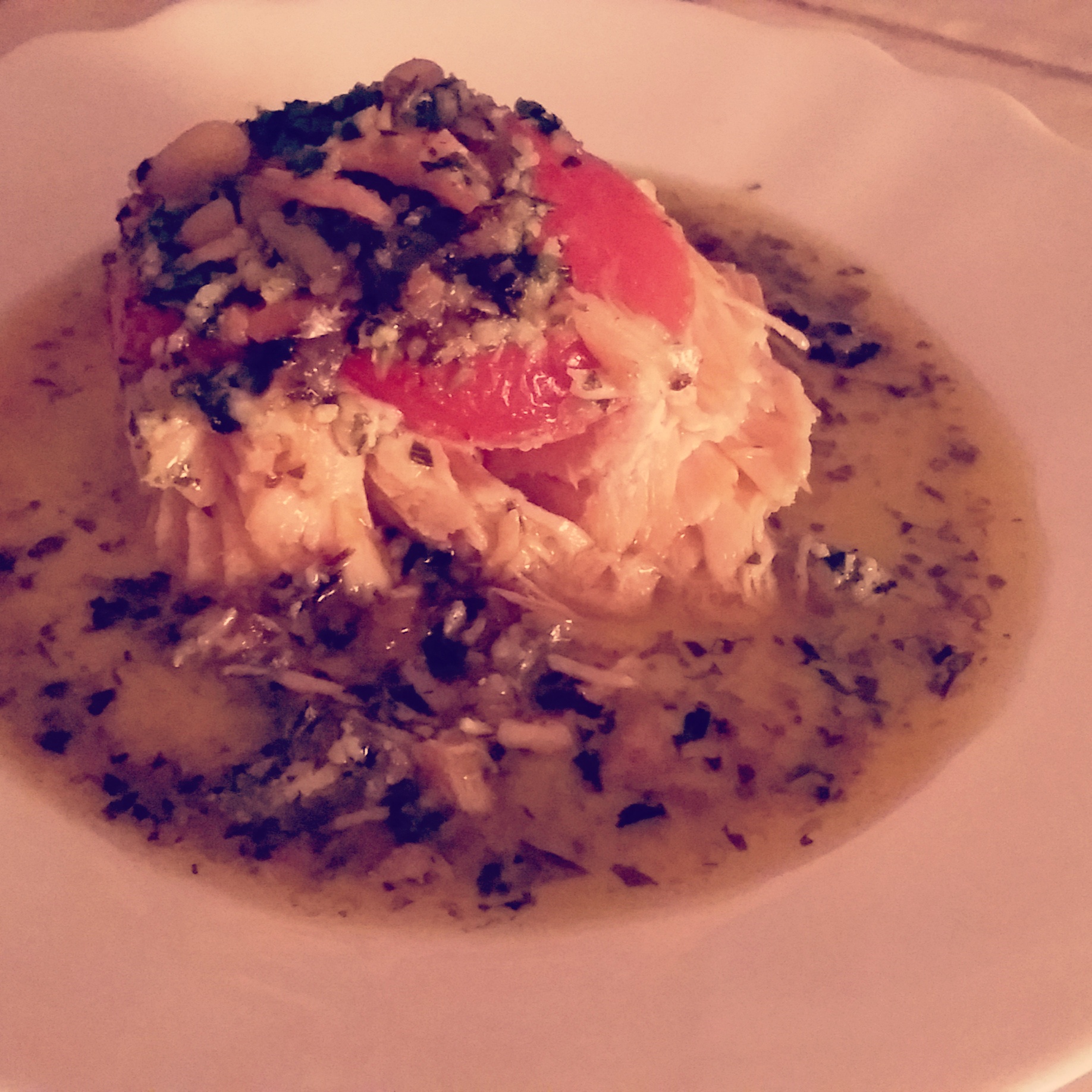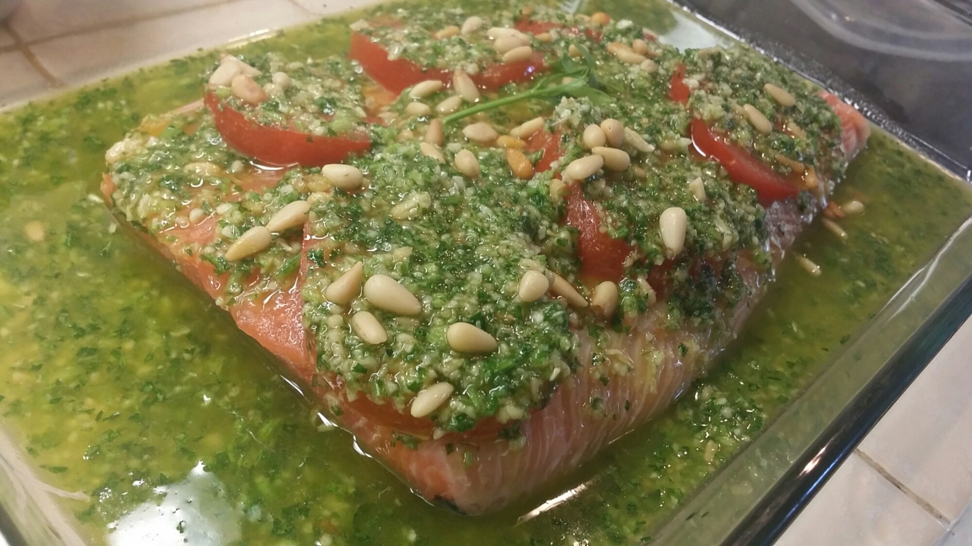 Dans un plat allant au four J’ai mis mon filet de saumon sur lequel j’ai placé des rondelles de tomates. Je l’ai ensuite recouvert du pesto de cerfeuille et y est ajouté quelques pignons pour faire joli. .