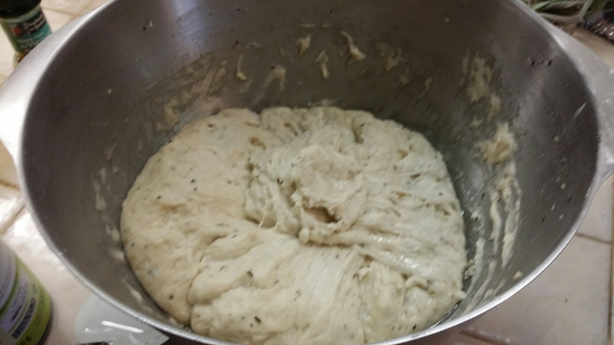 Délayez la levure dans un des mugs d’eau et mélangez au reste des ingrédients de cette première phase. Le mélange est liquide c’est normaux