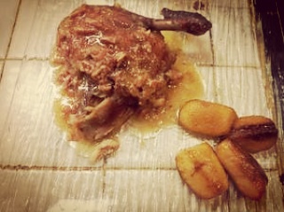 Pour le service mettre sur les assiettes un lit d’oignons et lardons, déposez un morceau de pintadeau, des quartiers de pommes et napper de sauce. Servir sans attendre.