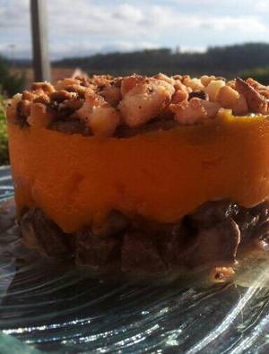 Dans un plat allant au four mettre les coeurs de canard puis recouvrir de la purée. Mettre une couche de crème de marron et émiettez le crumble.