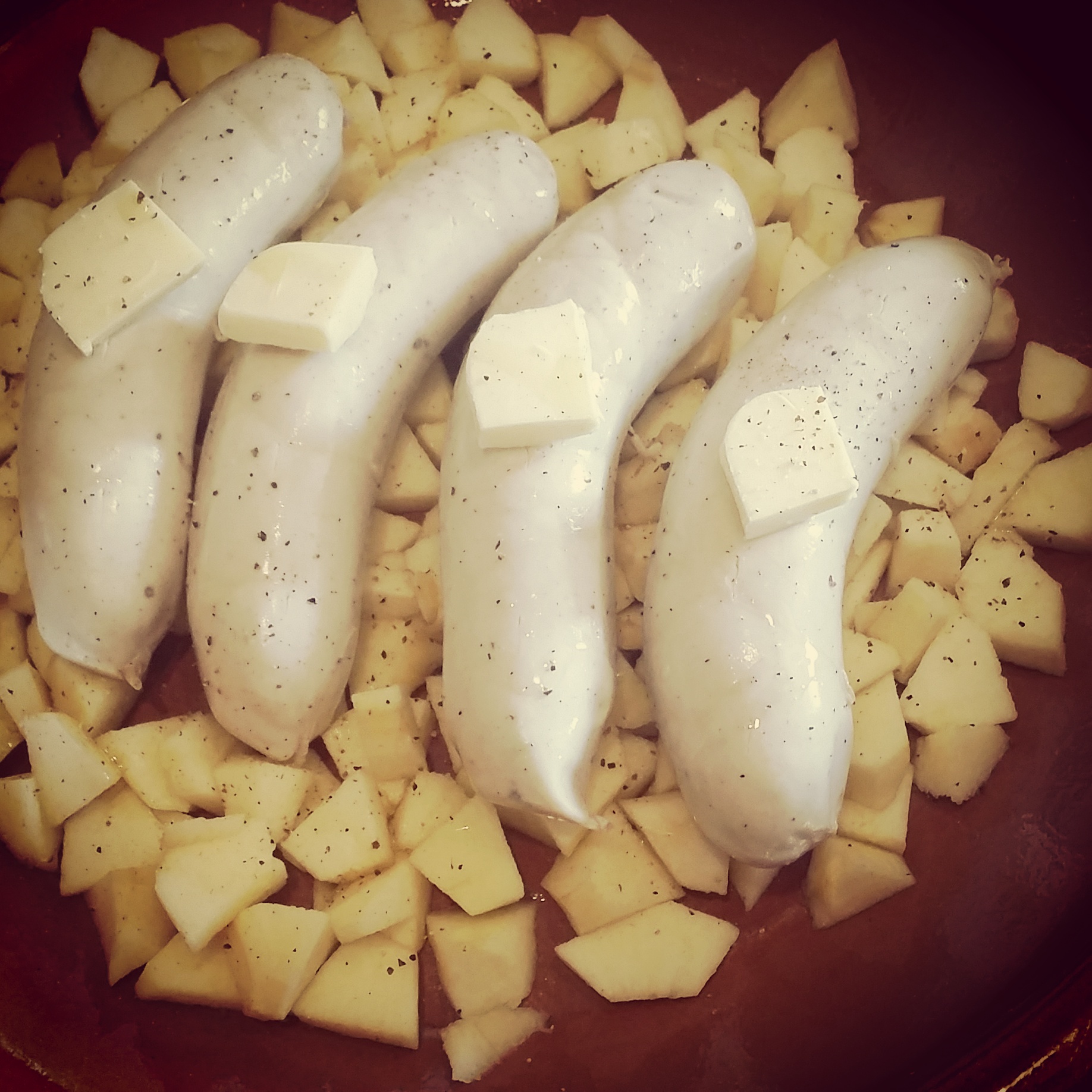 Déposez les boudins entiers sur les dés de fruits. Et sur chaque boudin déposez 2g de beurre.