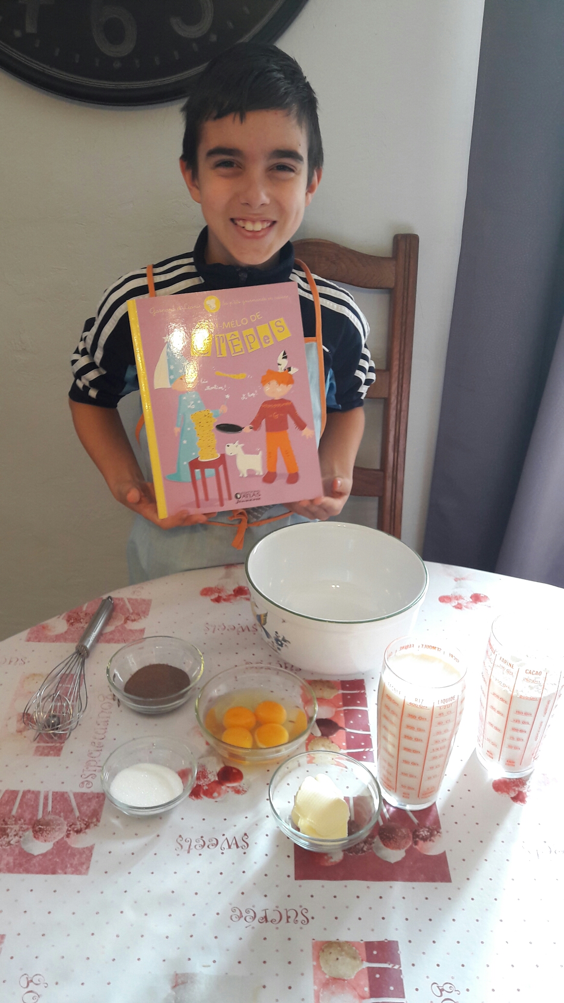 Hier mon grand a préparé ses crêpes pour l’école selon une recette tirée de sa collection de Livres de cuisine Gaspard et Léonie. Voilà la recette qu’il a suivit en la modifiant légèrement.