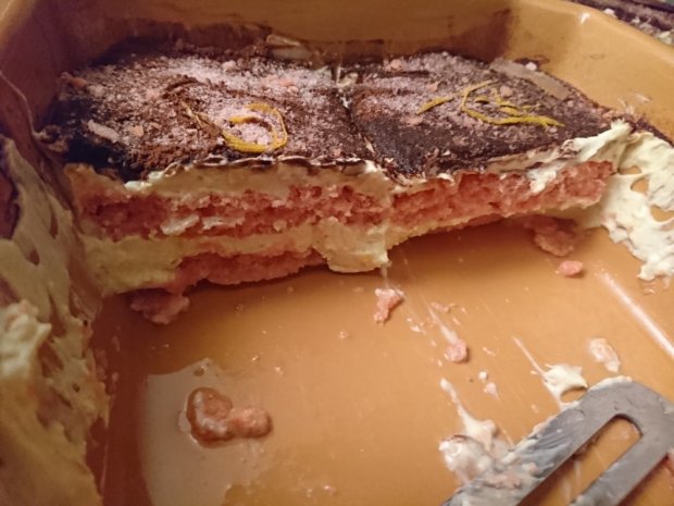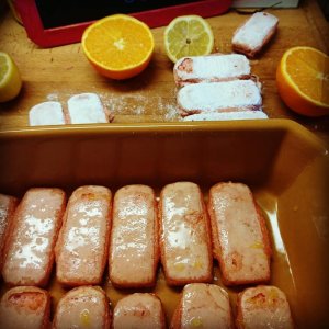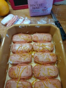 Trempez rapidement les biscuits dans le jus d’orange /citron pour les imbiber sans les casser. Disposez une couche de biscuits dans le fond d’un plat rectangulaire (environ 30x20x6).