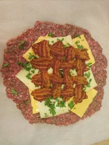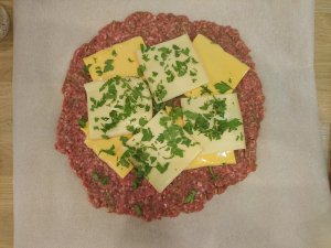 Maintenant passons à la garniture du steak de 600g. Mettre 4 tranches de chacun des 2 fromages, la moitié du persil et déposez le bacon dès qu’il est cuit.