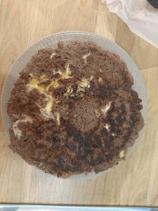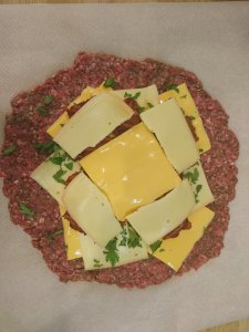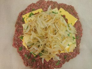 Recouvrez le tout avec l’autre steak haché et pincez bien les bord pour souder les deux steaks ensemble. Le mettre à dorer quelques minutes des deux côté dans une poêle chaude et beurrée. Vérifier qu’elle soit assez grande pour le steak géant avant 😂 utilisez une assiette pour le retourner dans le casser.