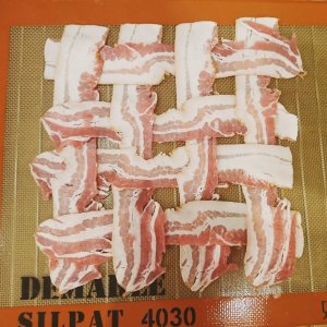 Sur une feuille de papier cuisson ou comme moi votre silpat de chez demarle, disposez joliment vos tranches de 🥓 et le mettre à cuire au four que vous avez mis à préchauffer à 180°c et cuire 30 minutes.