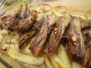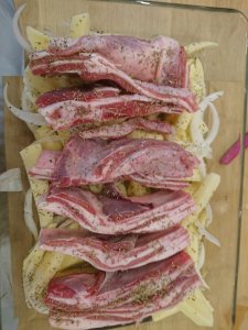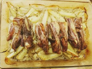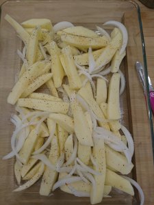 Pelez et coupez les pommes de terre comme des frites un peu épaisses. Mélangez les avec l’oignon émincé et l’ail écrasé. Les mettre dans un plat à gratin. Salez et poivrez à votre convenance.