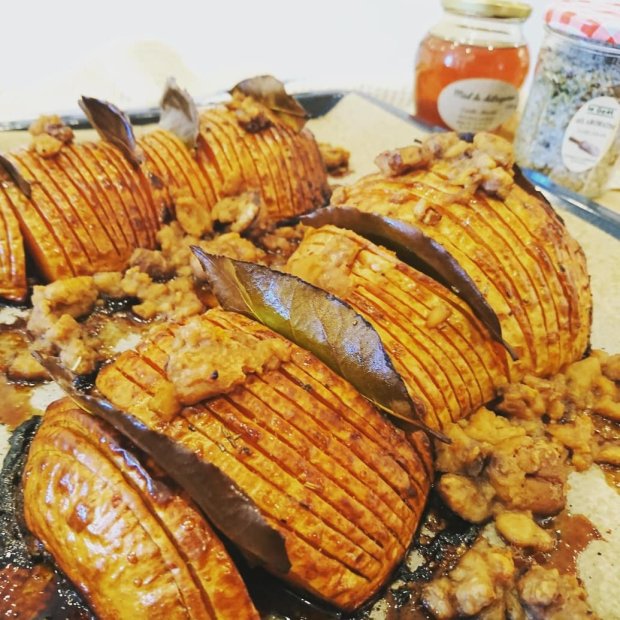 Repartir 4 feuilles de laurier sur chaque moitié de butternut entre les tranches, arrosez les chacune d’un filet d’huile d’olive puis parsemez les de sel garlaban