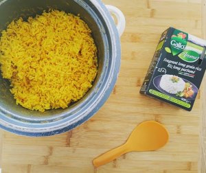 J’ai accompagné ma viande d’un riz assaisonné au curcuma en poudre de chez épices et plus et de sel exotique de chez vinaigre le goût