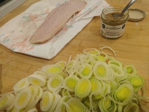 Alors comme cette recette a eut franc succès auprès de ma tribu, j’ai décidé de réitérer cette recette en remplaçant le chutneys d’aubergine par une petite fondue de poireaux à la crème et de la tapenade. Mais pas avec n’importe quelle tapenade. Non non non. Avec la tapenade de mon amie Virginie de la maison de la tapenade. J’ai donc choisi d’utiliser sa Tapenade à l’artichaut et parmesan.