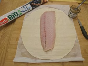 Déroulez votre pâte feuilletée et disposez en son centre le filet de lieu noir.