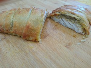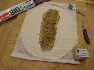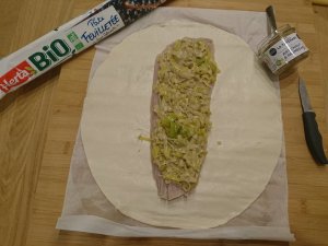 Déroulez la pâte et placer en son centre le filet de lieu noir. Disposez par dessus en couche superposé la fondue de poireaux puis la tapenade artichauts /parmesan.