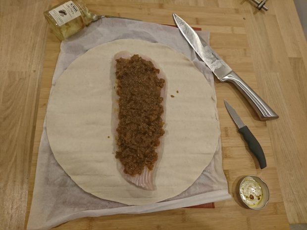Déroulez votre pâte feuilletée et disposez en son centre le filet de lieu noir.