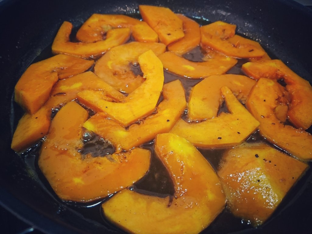 Dans une poêle allant au four faire fondre le beurre à feu doux. Ajoutez le sirop et les graines d’une gousse de vanille. Y déposer les tranches de butternut, les faire caraméliser à feu doux 2 min de chaque côté. Déglacez avec les 5 cl d’eau puis ajoutez la cassonade. Mélangez délicatement en retournant les tranches de butternut. Laissez mijoter à feu doux quelques minutes le temps que l’eau s’évapore un peu.