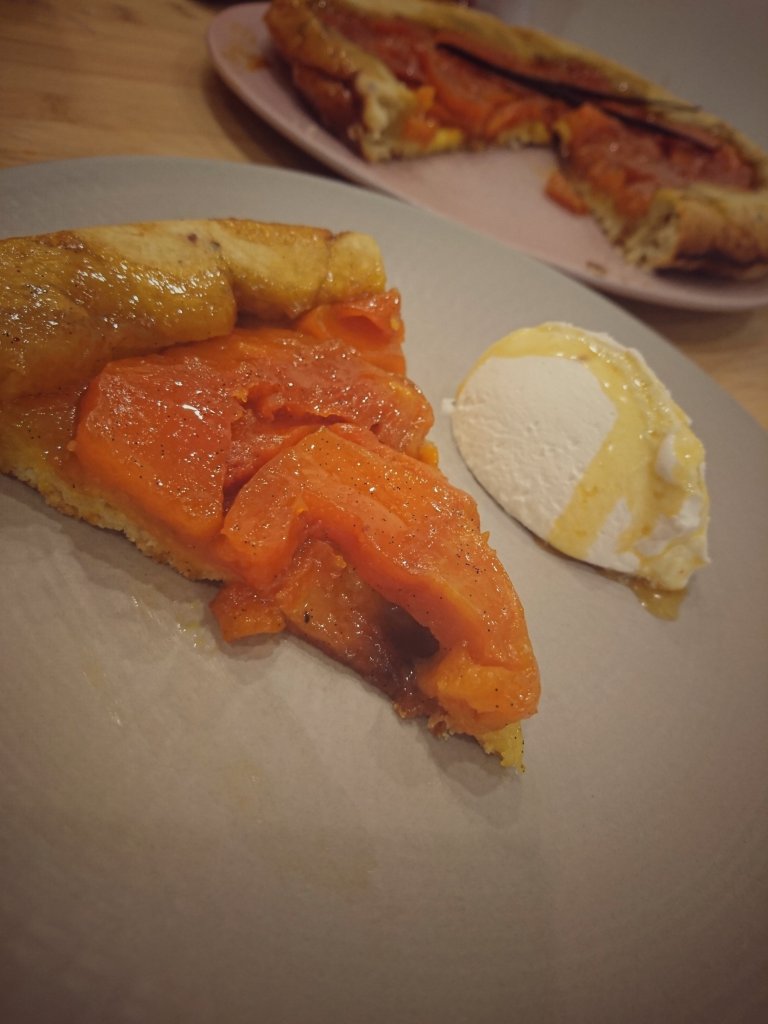 Cette tarte surprenante et goûteuse sera le dessert parfait de l’hiver accompagné d’une quenelle de chantilly/mascarpone à la liqueur de vanille et sirop de curcuma.
