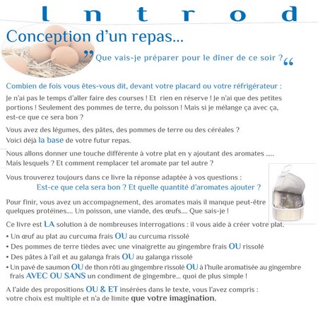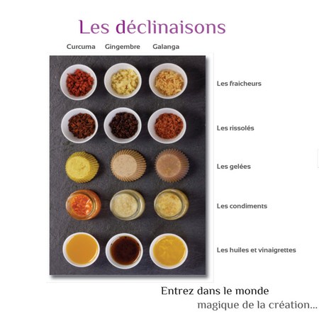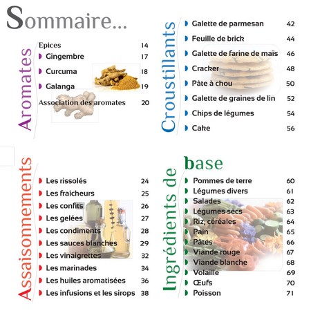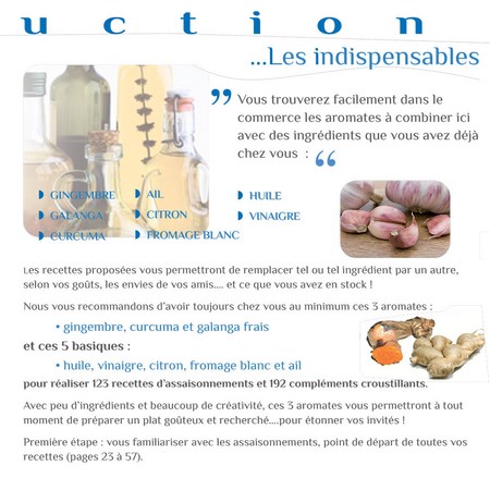 Dans cet ouvrage, Bruno nous proposes de réaliser 350 mets savoureux en utlisant seulement 5 ingrédients et ce en 30 minutes seulement de préparation. Le tout réhaussé de l’un des 3 aromates suivants : gingembre, curcuma et galanga. Bref vous l’aurez compris des recettes innovantes goûteuses et simples à réaliser que ce soit Frais, rissolés, en gelée, en condiments, en huiles et vinaigrettes, on y découvre 5 façons de les décliner.