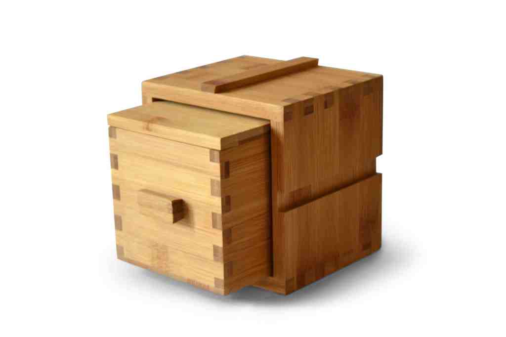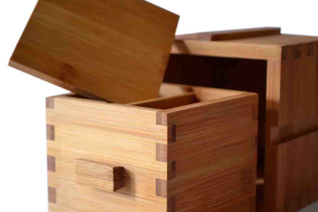 Chaque boîte est de forme cubique (110 mm de côté) et fabriquée artisanalement à partir de fibres de bambou. La fibre de bambou est reconnue pour sa légèreté, ses performances mécaniques et ses propriétés hygroscopiques (le bambou absorbe l’humidité) donc parfaitement idéales pour la conservation des poudres, des graines aromatiques, des céréales et des légumineuses. Un vernis alimentaire est appliqué sur chaque boîte pour lui assurer une finition antitache et inodore, conformément aux normes en vigueur 10/2011/CE.