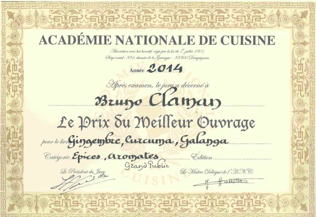 Saviez vous que cet ouvrage fût primée au Grand Prix 2014 de Littérature Culinaire organisé par l’Emblématique Académie Nationale de Cuisine? Il fût Sélectionné parmi plus d’une centaine de titres et hissé à la 31ème place. L’ouvrage de Bruno primé dans la catégorie « Les épices et les aromates » , compte désormais parmi les livres de recettes « vivement recommandés par l’Académie Natonale de Cuisine ».
