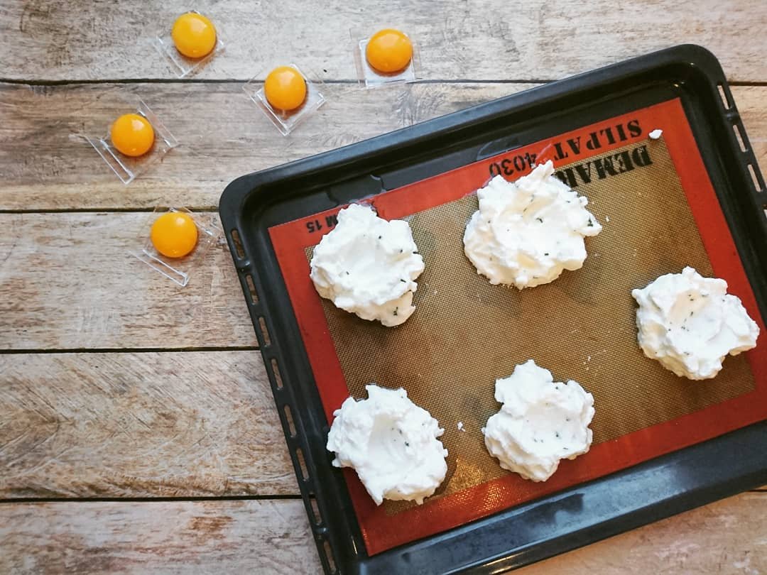 Disposez et divisez à l’aide d’une cuillère à soupe les blancs d’oeufs en neige en 5. À l’aide du dos de votre cuillère a soupe creusez un puis dans chaque.