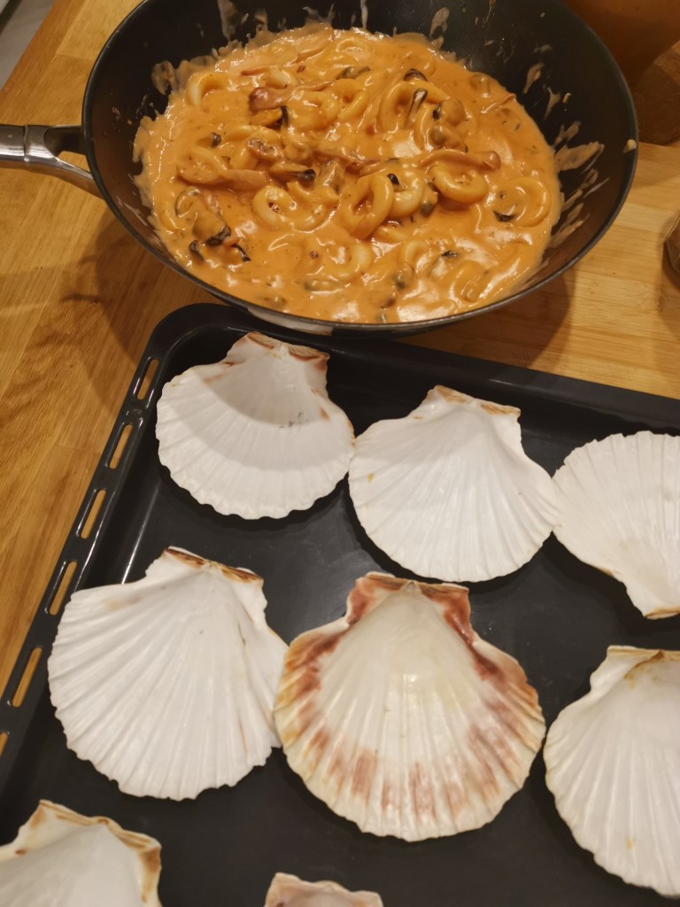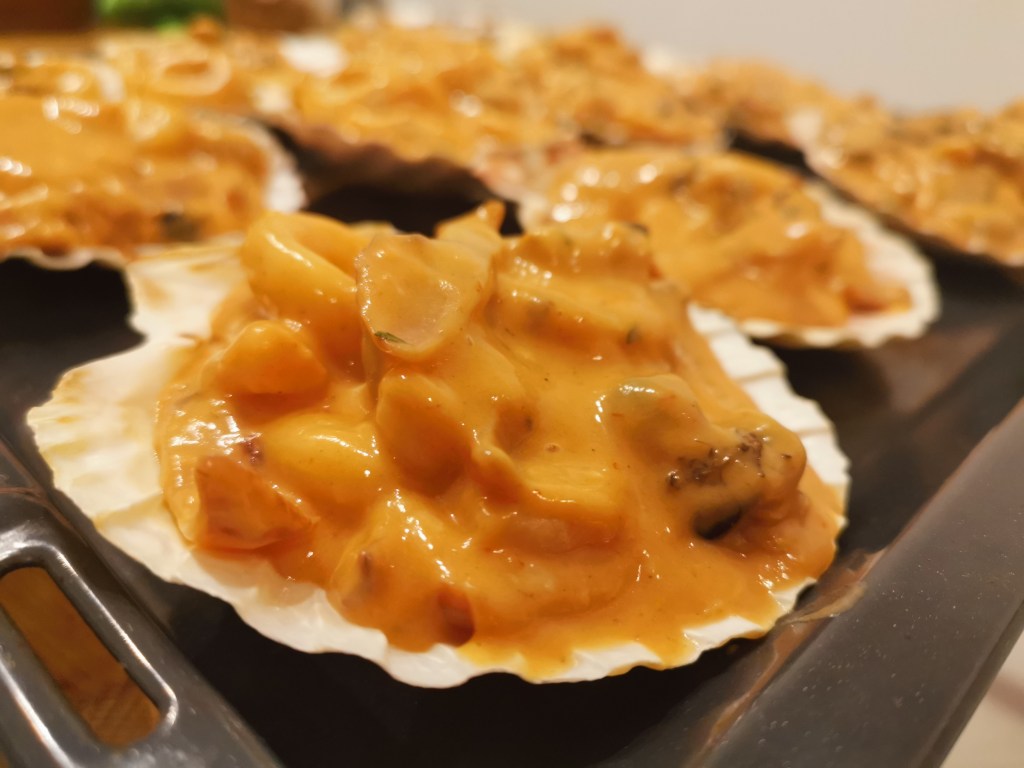 Ayant une grosse envie de coquilles saint jaque au four gratinées et n’en n’ayant pas grrrr mis à part un cocktail de fruit de mer au congel, j’ai demandé de l’aide aux filles de mon groupe de cuisine. Ma miina m’a donné quelques conseils dont j’ai fait quelques modif, mais vraiment pas beaucoup si ce n’est de rajouter du sucre