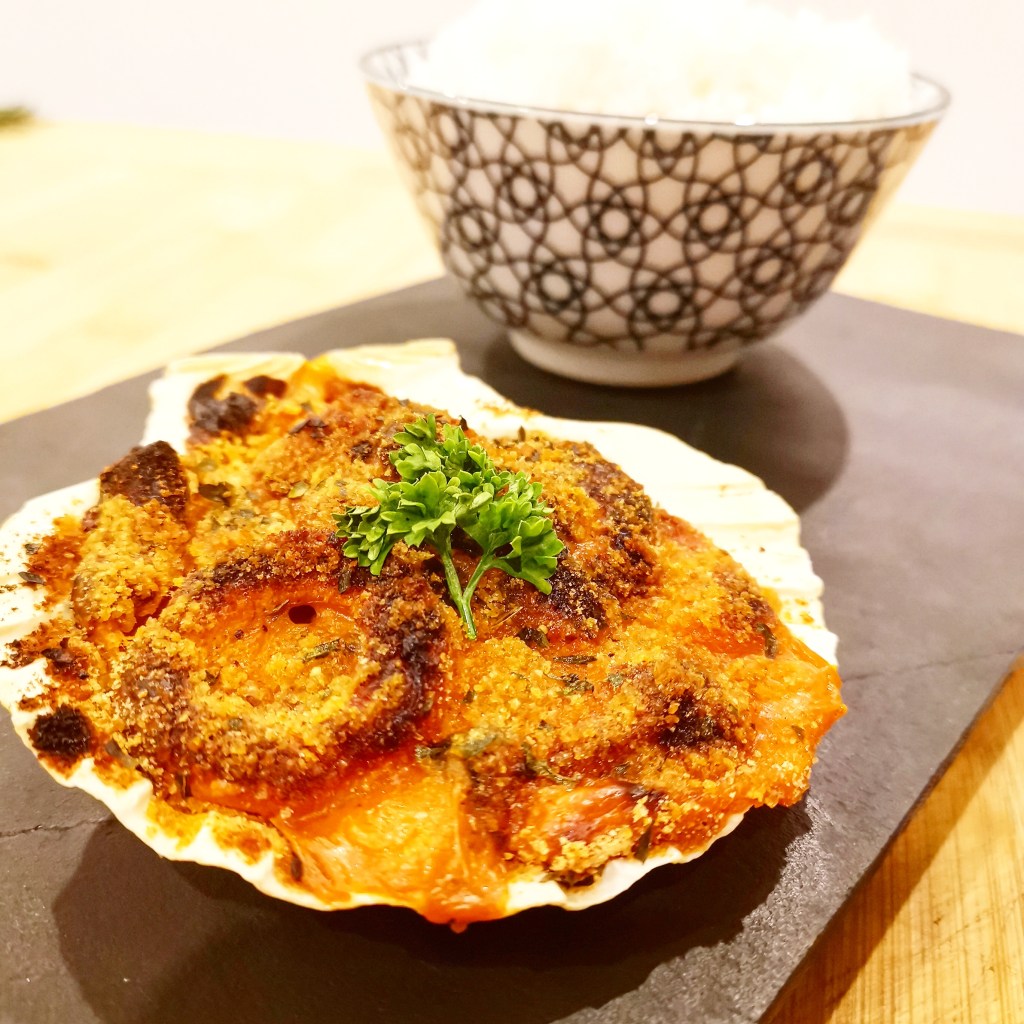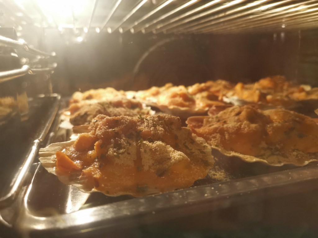 5. dans des coquilles de saint jacques vide, mettre la préparation, la chapelure, du persil déshydrataté, puis à l’aide d’un petit spray d’huile d’olive aspergez les ou si vous n’en avez pas versez un filet d’huile d’olive sur chacune.