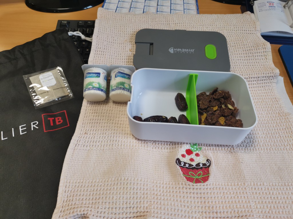 Pour la collation, entre 16h30 et 17h30, le programme propose une barre de cacahuètes ou un sachet de biscuits, à manger avec un fruit. J’ai reçu des bouchées gourmandes sans gluten, enrobées de chocolat blanc une tuerie c’est à ce moment là que j’ai regretté d’avoir laissé monsieur faire le test à ma place 😂