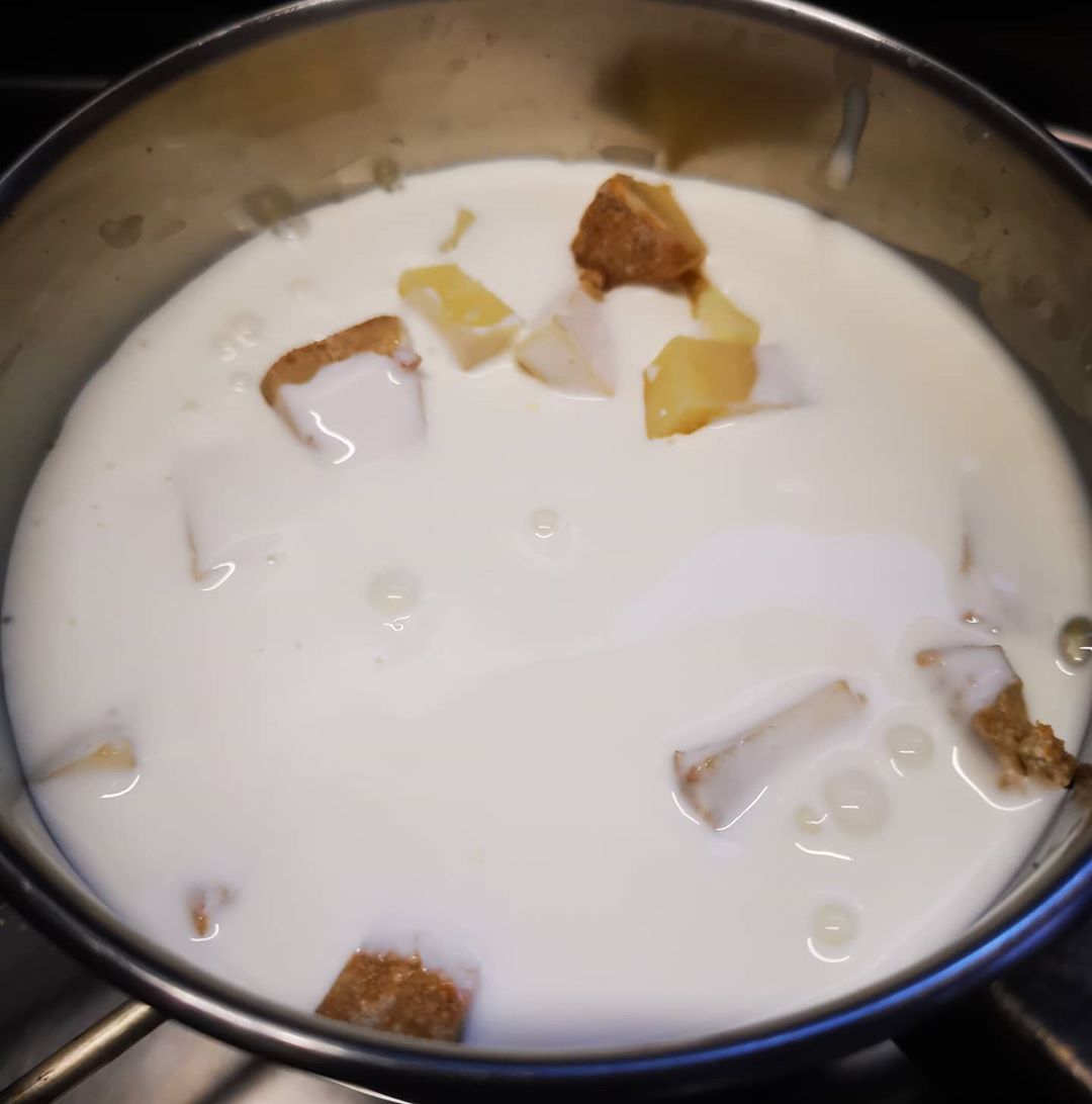 Dans une casseroles faire fondre sur feu doux le cantal coupé en morceaux dans la crème en remuant de temps à autre.