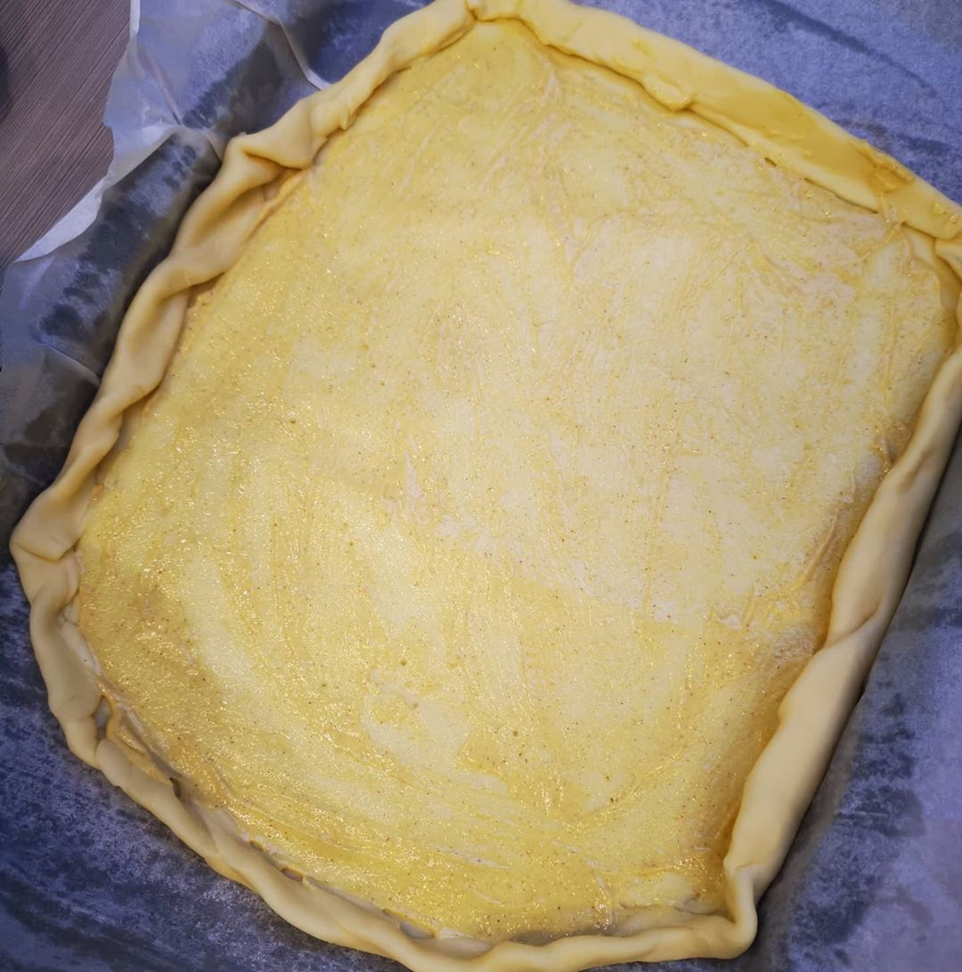 Étalez votre pâte brisée dans un plat allant au four, piquez la pâte à l’aide d’une fourchette et étalez y la moutarde.
