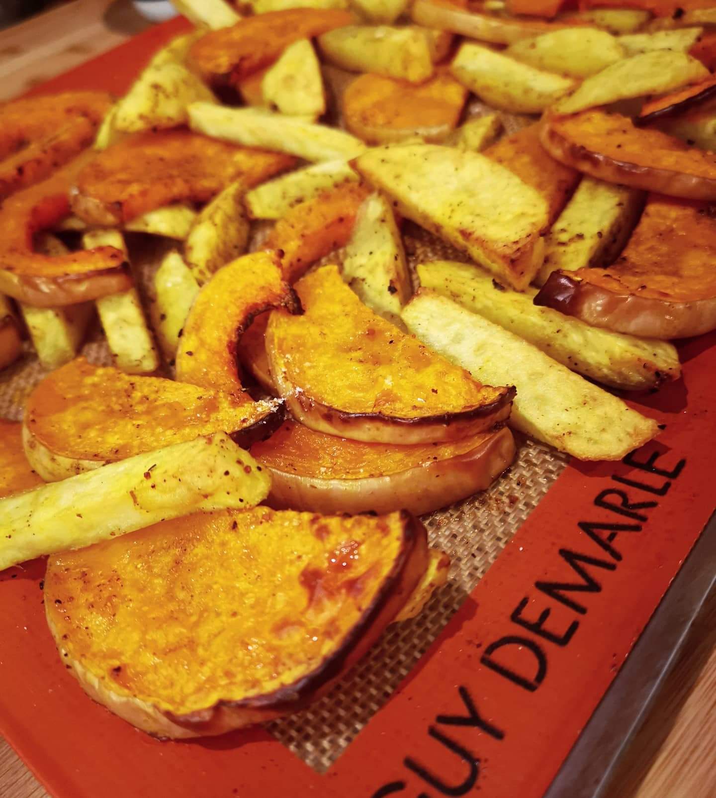 1 cm la demi butternut avec la peau (oui oui la peau se mange). Épluchez et coupez en frites les pommes de terre.