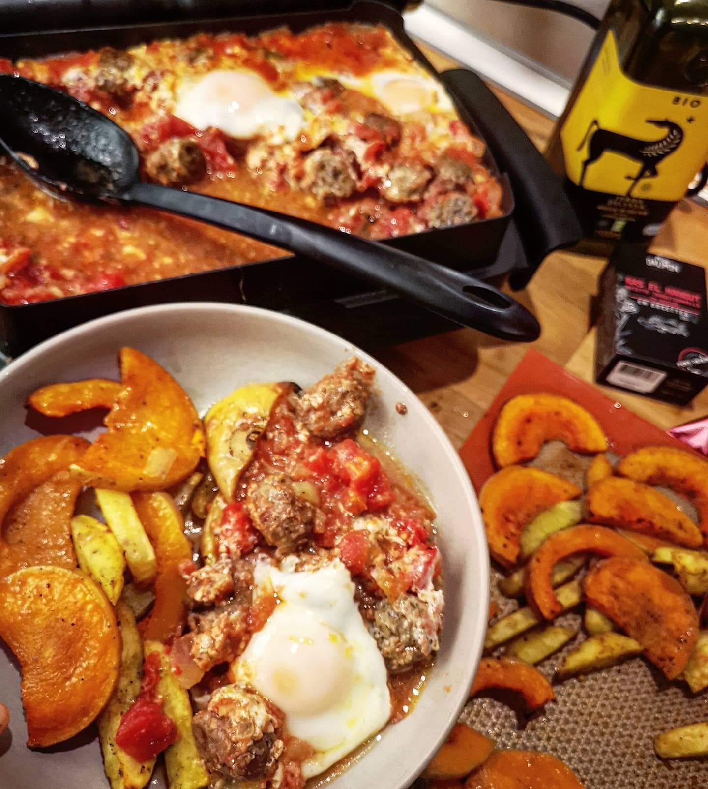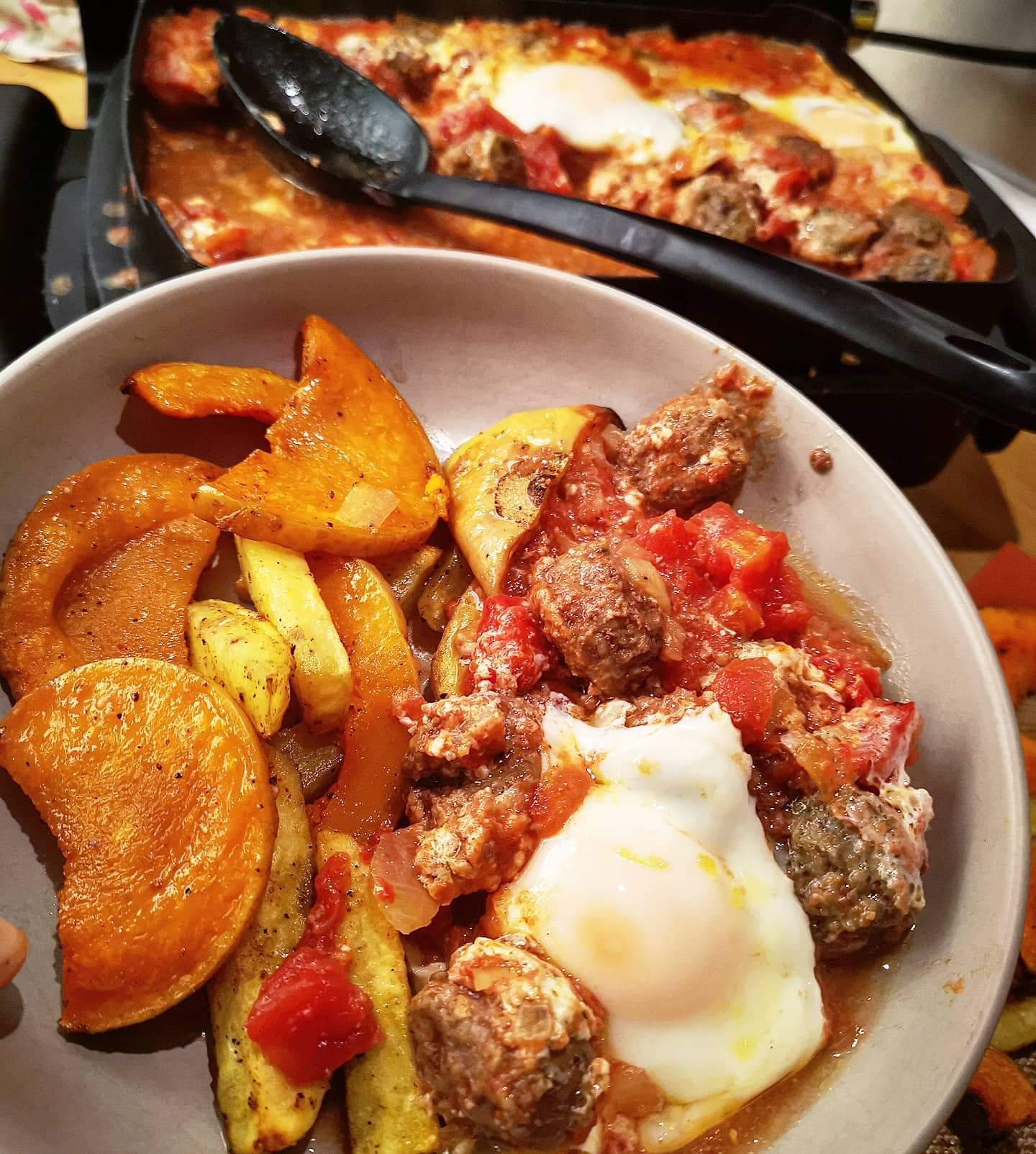 Lorsque les boulettes sont cuites ajoutez les œufs par dessus, abaissez le couvercle et prolongez la cuisson quelques minutes le temps que le blanc de l’œuf soit cuit.
