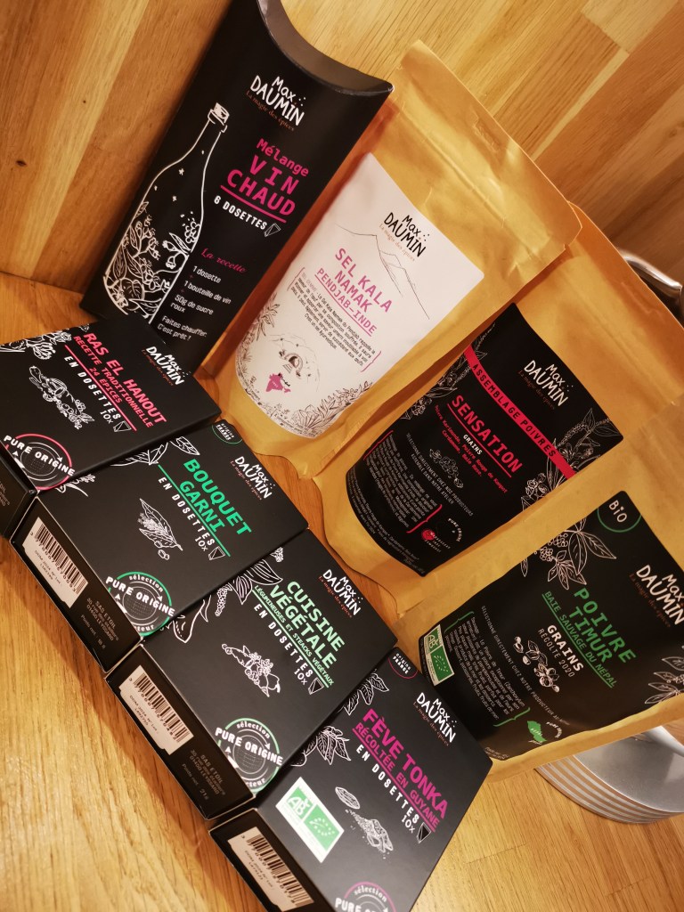 Avant hier j’ai eu le plaisir de recevoir de mon partenaire culinaire Épices Max Daumin un joli colis plein d’épices.