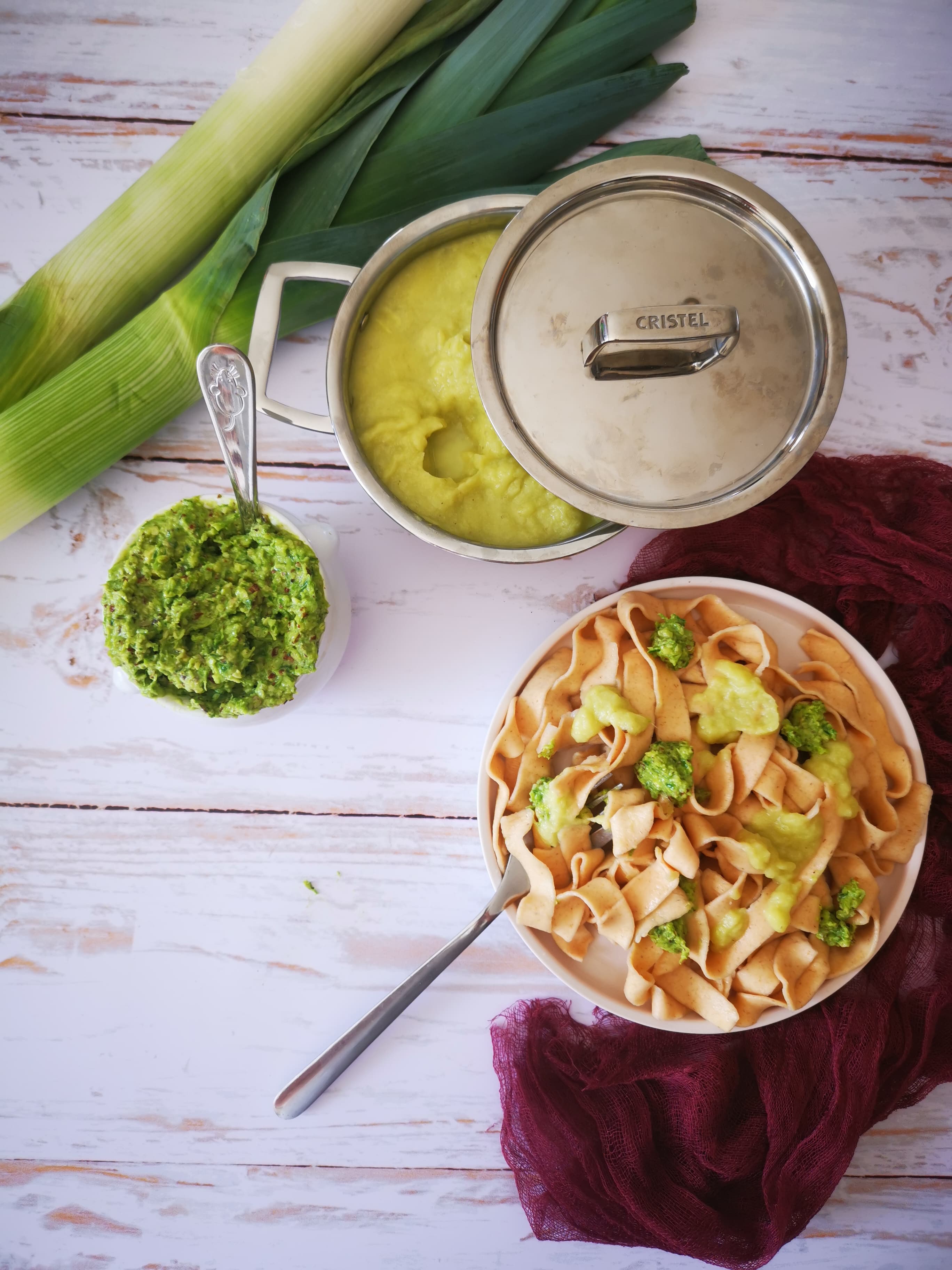 Tagliatelles aux lentilles corail, pesto au vert de poireaux et sauce crémeuse au blanc de poireaux
