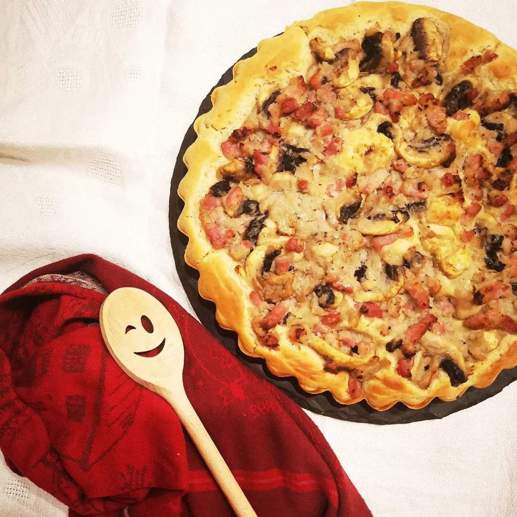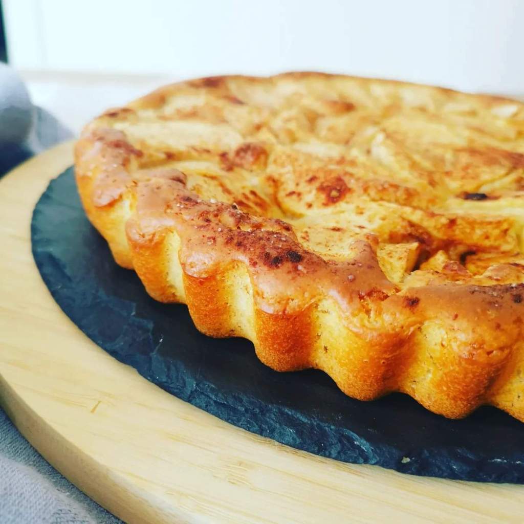 Ici j’ai réalisé une tarte briochée aux pommes sopoudrez de cannelle et une aux champignons, lardons et oignons que j’ai préalablement fais revenir avec un peu de crème.