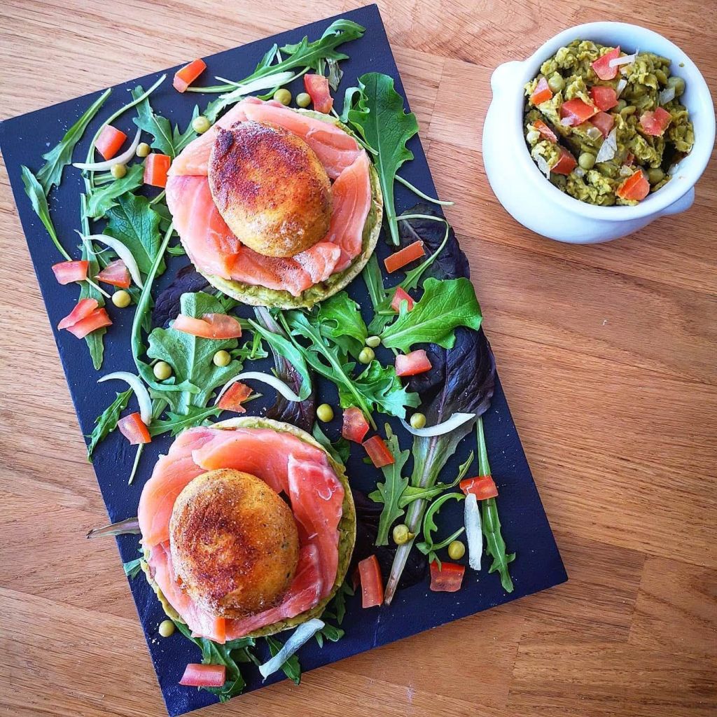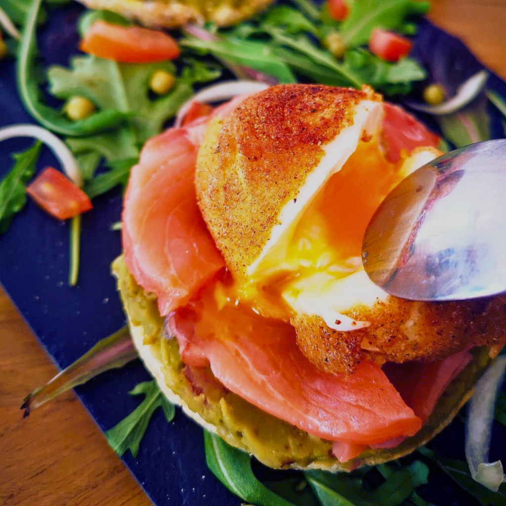 Envie dâune recette originale, pleine de peps et de textures ? Laisse-moi te (re)prĂ©senter une pĂ©pite culinaire que jâai créée en 2020⊠et que je rĂȘve de remettre Ă lâhonneur aujourdâhui : lâĆuf mollet frit dans son nid de saumon fumĂ© & guacamole aux petits pois.
