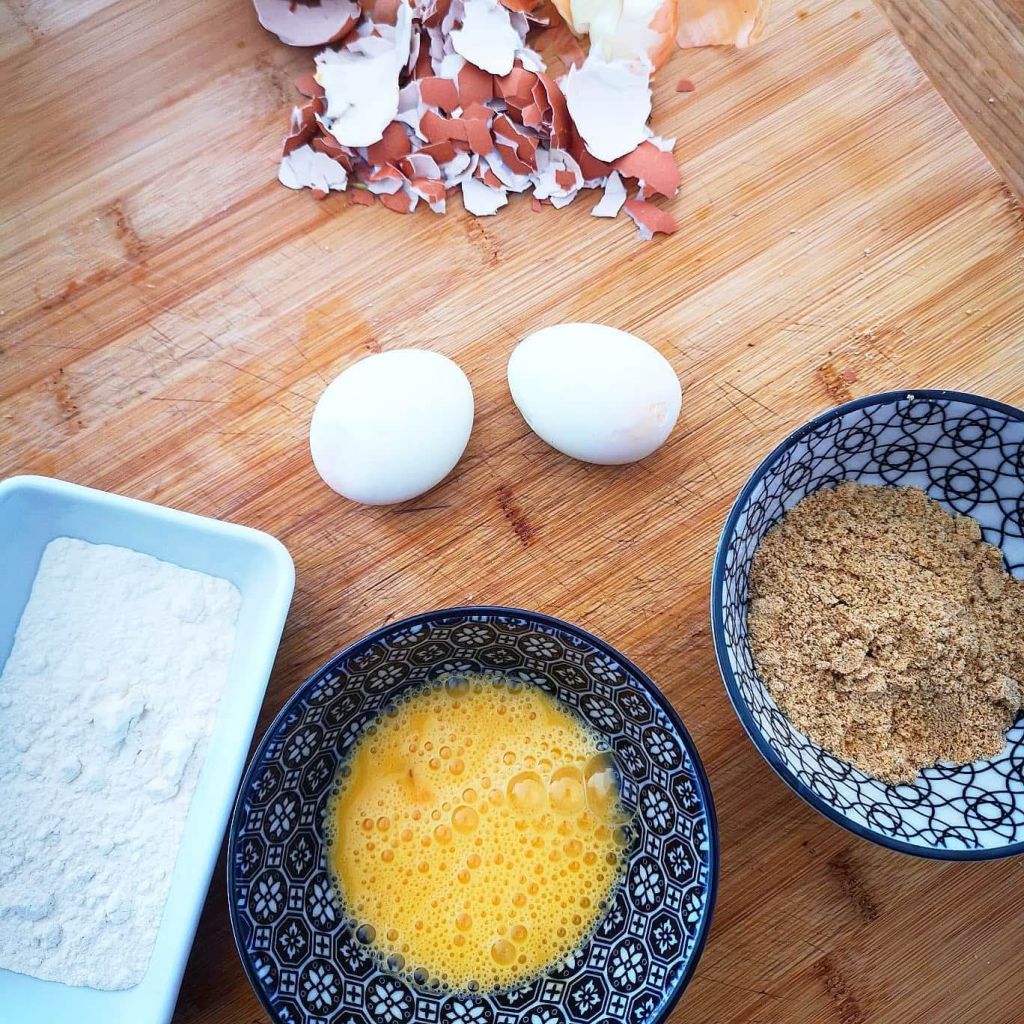 Roule chaque Ćuf mollet dans la farine, puis dans lâĆuf battu, et enfin dans ta chapelure maison parfumĂ©e.