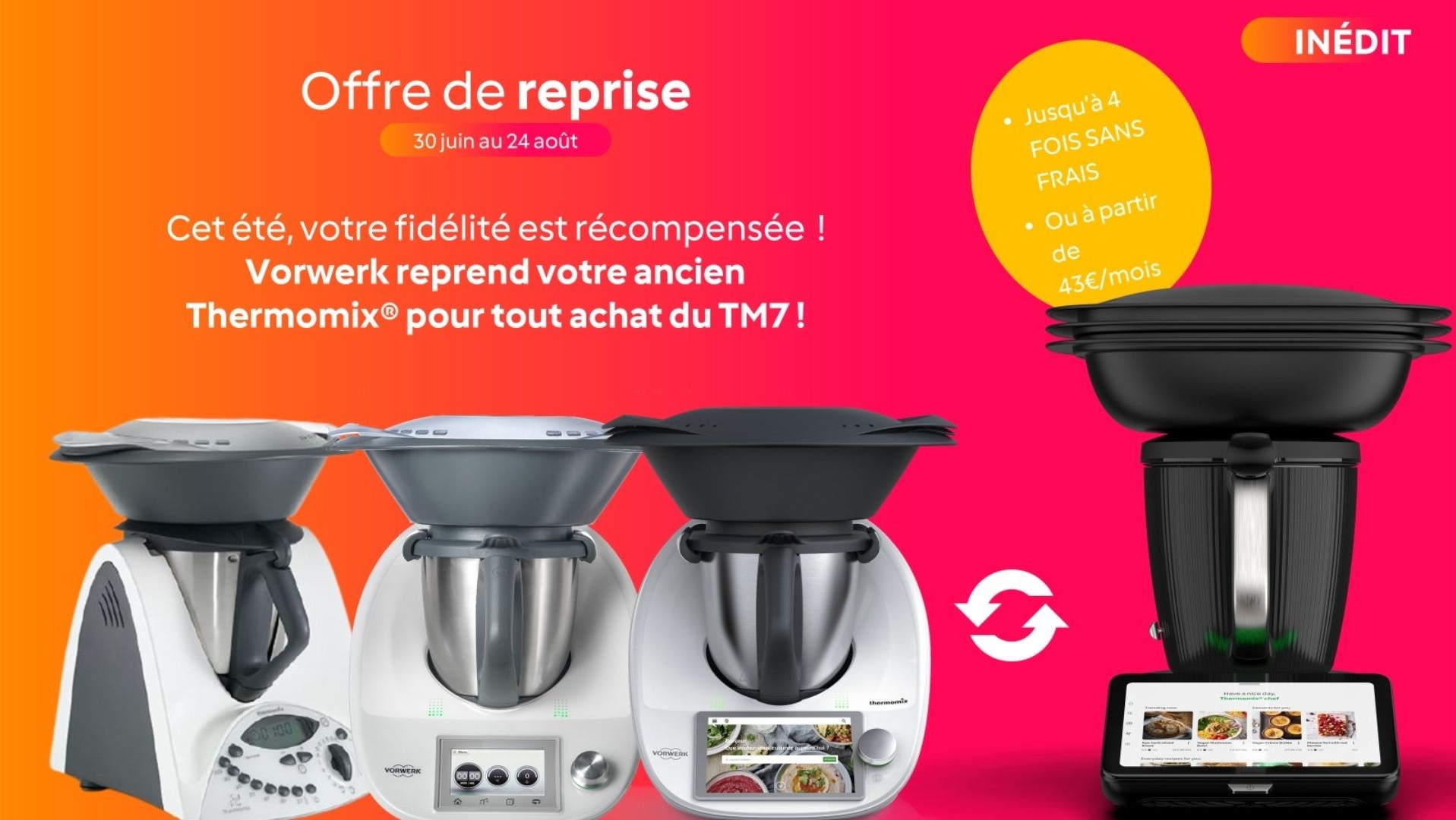 Du 30 juin au 24 août 2025, Vorwerk vous propose une reprise de votre ancien ThermomixŸ, peu importe son état :